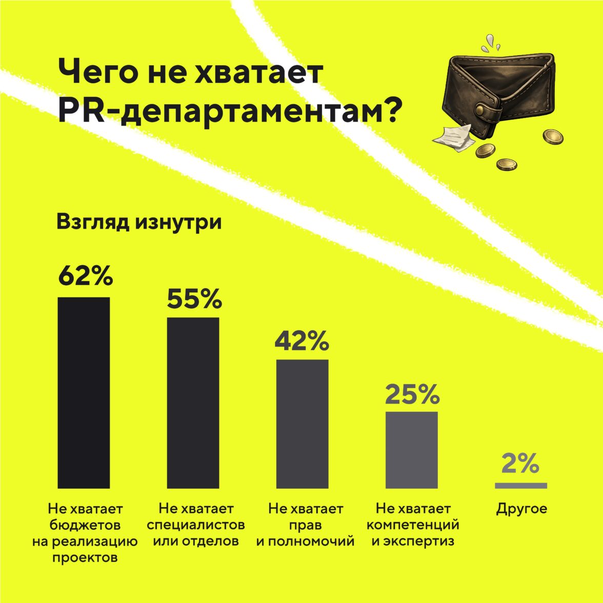 Мы задали респондентам вопрос: чего, по вашему мнению, не хватает современным PR-отделам? Пиарщики, работающие внутри компаний, рассказали, что им не хватает бюджетов (62%), специалистов (55%), прав и полномочий (42%). Значительно в меньшей мере отмечали недостаток компетенций и экспертизы (25%).