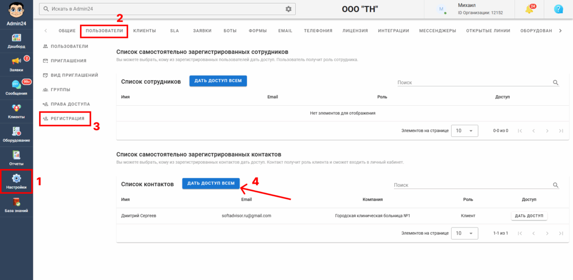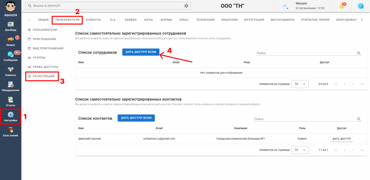 Также была добавлена возможность массово выдать доступ самостоятельно зарегистрировавшимся клиентам и сотрудникам. Для этого перейдите в «Настройки» → «Пользователи» → «Регистрация» и кликните по кнопке «Дать доступ всем» в блоках «Список сотрудников» и «Список контактов»: