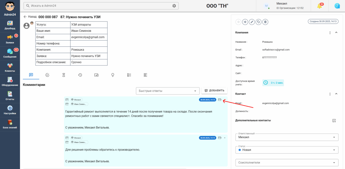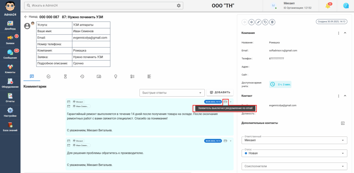 Если клиент выключил уведомление по email в своем личном кабинете, то, при добавлении комментария к его заявке, отобразится иконка в виде конверта с восклицательным знаком.