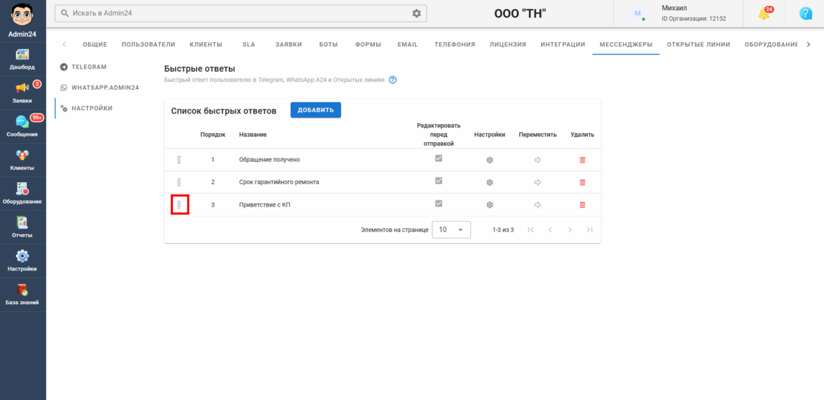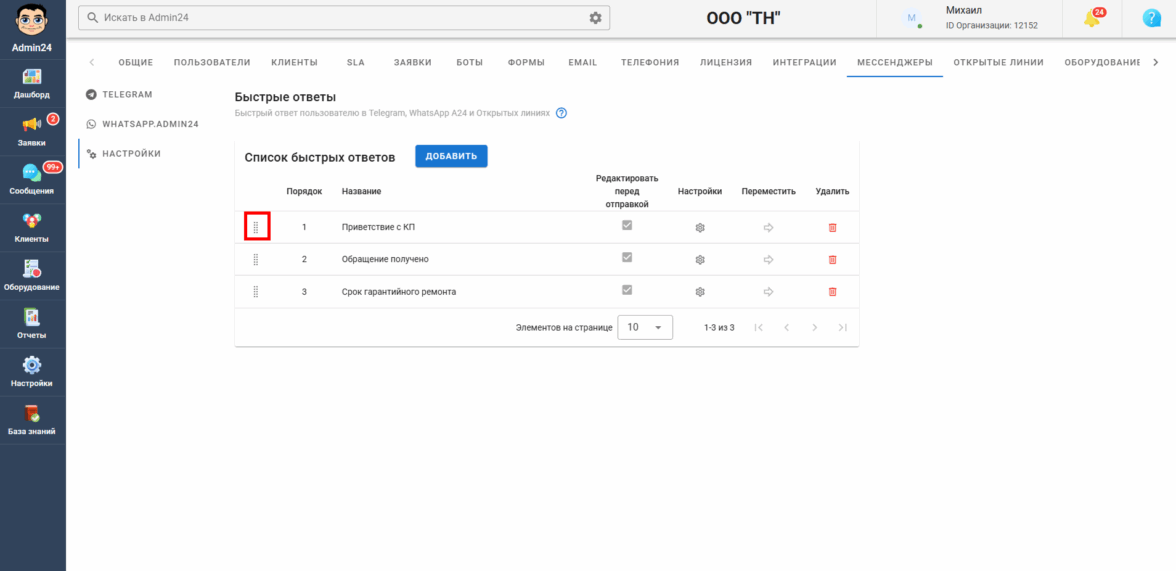Также была добавлена возможность менять порядок быстрых ответов для заявок/мессенджеров. Для этого перейдите в список быстрых ответов и перетащите их на нужное место при помощи многоточия.