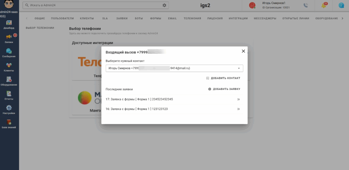 В этом же окне можно добавить контакт или создать новую заявку для контакта.