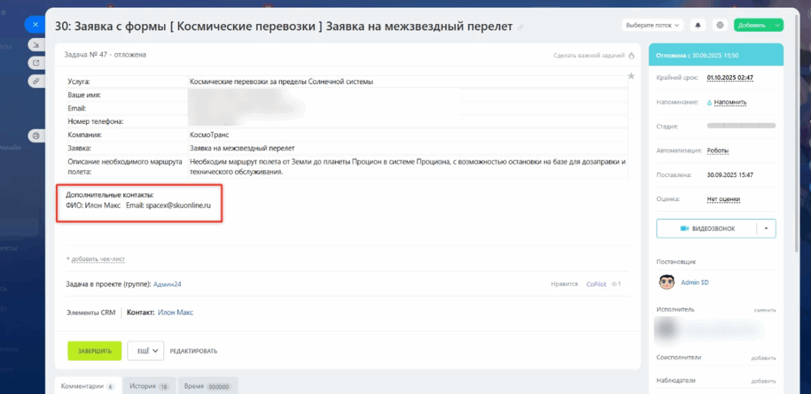 В обновлении был реализован функционал синхронизации дополнительных контактов в заявке. Если дополнительный контакт существует в Битрикс24, он добавляется как элемент CRM в описании заявки: «Дополнительные контакты: ФИО: {fullName} Email: {email}».