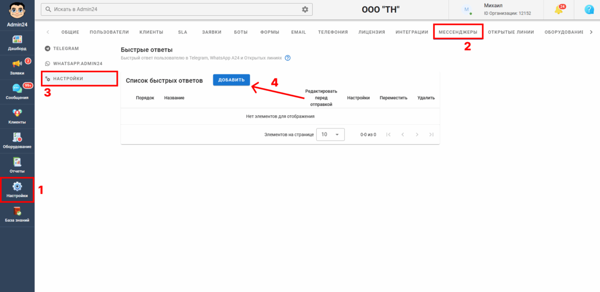 Быстрые ответы в Telegram и WhatsApp*. Теперь вы можете отправлять быстрые ответы в чатах Telegram и WhatsApp* вашим клиентам. Для настройки быстрых ответов перейдите в «Настройки» → «Мессенджеры» → «Настройки», кликните по кнопке «Добавить».
