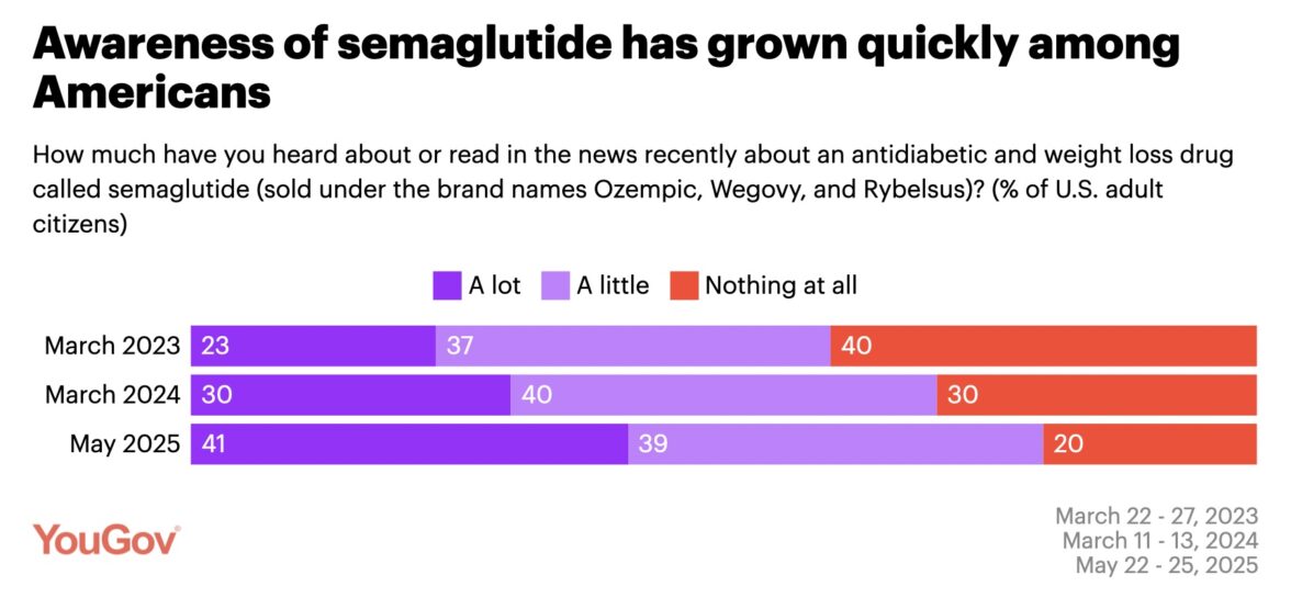 Как показал опрос YouGov, за последние два года сильно выросла осведомленность жителей США о препаратах для снижения веса на основе семаглутида (оземпик и другие). В мае 2025 года о таких препаратах слышали 80% американцев (41% хорошо осведомлены, 39% — в меньшей степени). 7% сообщили, что принимали такие препараты сами, 14% — что их принимал родственник, 16% — что их принимал друг, 11% — что их принимал знакомый.