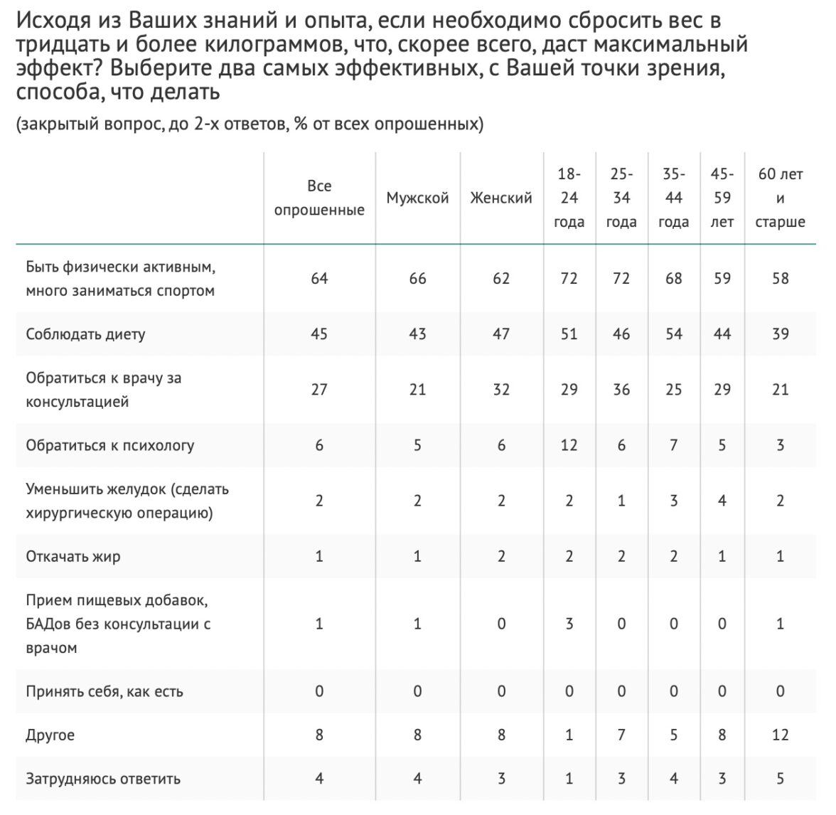 По данным опроса ВЦИОМ, самым эффективным способом снижения веса (аж на 30 кг и более) две трети (64%) россиян считают физическую активность. Почти половина (45%) респондентов высказалась за диету. Примерно каждый четвертый (27%) считает, что следует с этим вопросом обращаться к врачу.