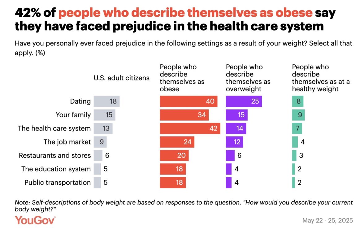 В обеих странах люди с избыточной массой тела чувствуют давление со стороны окружающих. В опубликованном в августе 2025 года опросе YouGov приводятся следующие данные. Американцы, признающие, что они страдают ожирением, часто сталкиваются с предвзятым к ним отношением со стороны общества. Чаще всего — в системе здравоохранения, о чем сообщили 42% опрошенных. Чуть реже — на свиданиях (40% опрошенных). Каждый третий (34%) сталкивался с этим в семье. Каждый четвертый (24%) — на рынке труда.