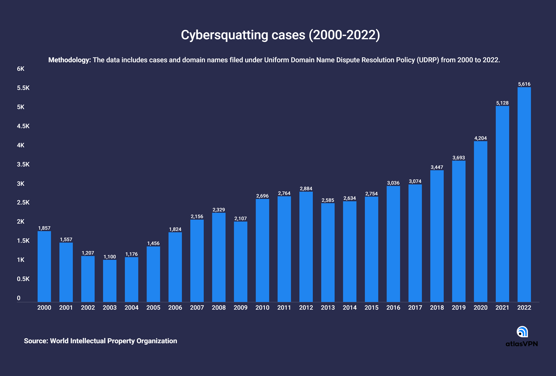 В отчете ВОИС говорится, что в 2022 году было открыто 5 516 дел, связанных с проблемой киберсквоттинга. Данные показывают, что только в этом году количество фейковых сайтов увеличилось на 10% по сравнению с предыдущим.