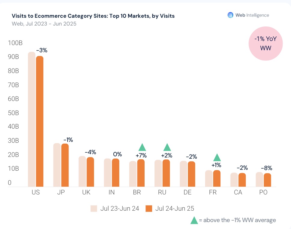 10 крупнейших национальных рынков электронной коммерции. По вертикали — посещаемость в миллиардах, светлое — в период с июля 2023 года по июнь 2024 года, темное — с июля 2024 года по июль 2025 года. Зеленый треугольник — рост более, чем на 1%. По горизонтали (слева направо): США, Япония, Великобритания, Индия, Бразилия, Россия, Германия, Франция, Канада, Польша.