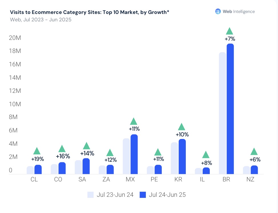 10 национальных рынков электронной коммерции с самыми высокими темпами роста. Cветлое — в период с июля 2023 года по июнь 2024 года, темное — с июля 2024 года по июнь 2025 года. Зеленый треугольник — рост более, чем на 1%. По горизонтали (слева направо): Чили, Колумбия, Саудовская Аравия, ЮАР, Мексика, Перу, Южная Корея, Израиль, Бразилия, Новая Зеландия.