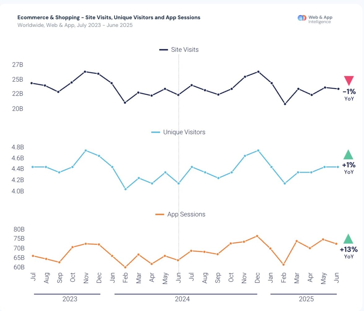 Глобальная электронная коммерция и шоппинг в период с июля 2023 по июнь 2025 года. Показатели на вертикальной шкале приводятся в миллиардах. Синяя линия — посещаемость сайтов, голубая — число уникальных посетителей, оранжевая — число сессий в мобильных приложениях.