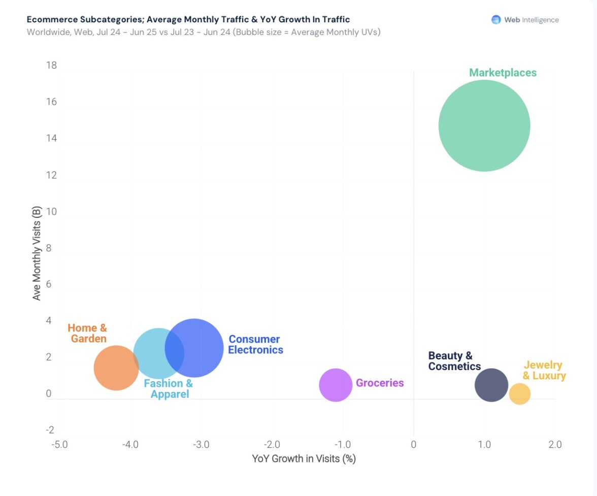 Маркетплейсы привлекают как наибольший ежемесячный трафик, так и самую большую аудиторию в электронной коммерции, и продолжают расти из года в год. В то же время, в основных подкатегориях розничной торговли, таких как «мода и одежда», «бытовая электроника» и «товары для дома и сада», наблюдается снижение трафика. Это говорит об ухудшении ситуации для розничных продавцов, работающих в данных категориях. Ситуация в категориях «продовольственные товары», «парфюмерия и косметика» относительно стабильная, а категория «ювелирные изделия и предметы роскоши» демонстрирует умеренный рост, несмотря на более низкую базу.