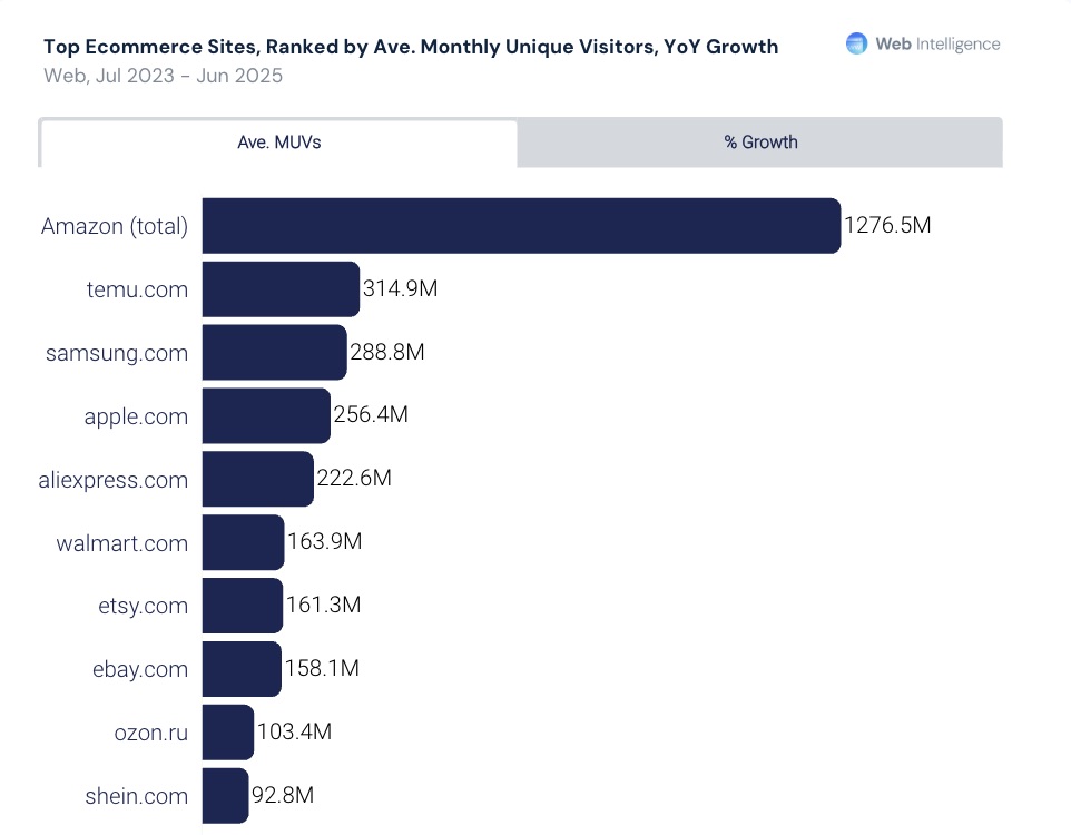 Непререкаемым мировым лидером среди сайтов e-commerce остается Amazon — почти 1,3 млрд уников в месяц.. На втором месте — китайский маркетплейс Temu с числом уникальных посетителей в четыре раза меньше, чем у Amazon. На третьем — сайт Samsung, на четвертом — Apple, на пятом — Aliexpress. В топ-10 входит один российский сайт — ozon.ru (9-е место, 103,4 млн посетителей).