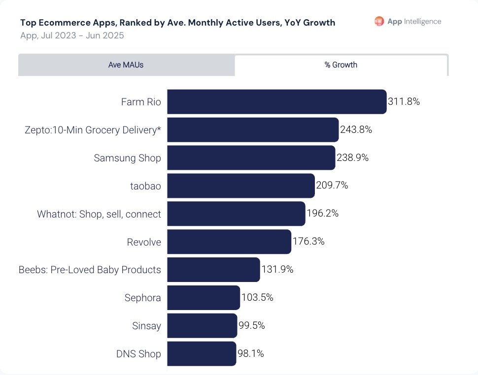 Сайты электронной коммерции, показавшие самый высокий прирост числа уникальных посетителей в месяц в июне 2025 года по сравнению с июлем 2023 года.