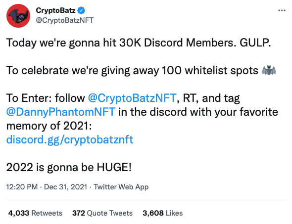 Твит от CryptoBatz с мошеннической ссылкой, опубликованный 31 декабря 2021 года, получил более 4 тыс. ретвитов и сотни ответов. Он был удален 21 января только после того, как The Verge связалось с CryptoBatz.