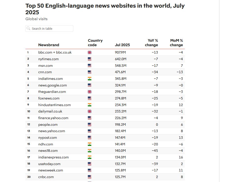 На первом месте по трафику стоит британский BBC. В июле 2025 на bbc.com и bbc.co.uk пришли 908 млн пользователей. Это на 13% меньше, чем в июле 2024. Однако аналитики связывают падение трафика с потерей части американской аудитории после введения пейвола в конце июня этого года. Для американцев издание ввело подписку — $8.99 в месяц и $49.99 в год. Несмотря на то, что под пейвол издание спрятало только эксклюзивные материалы, в в США BBC скатился с 7 на 14 строчку в списке самых популярных новостных сайтов в июле 2025.