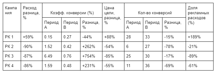 Несмотря на существенное снижение расходов (на 90%) коэффициент конверсии увеличился более чем в 2,5 раза. Однако общее количество конверсий снизилось.