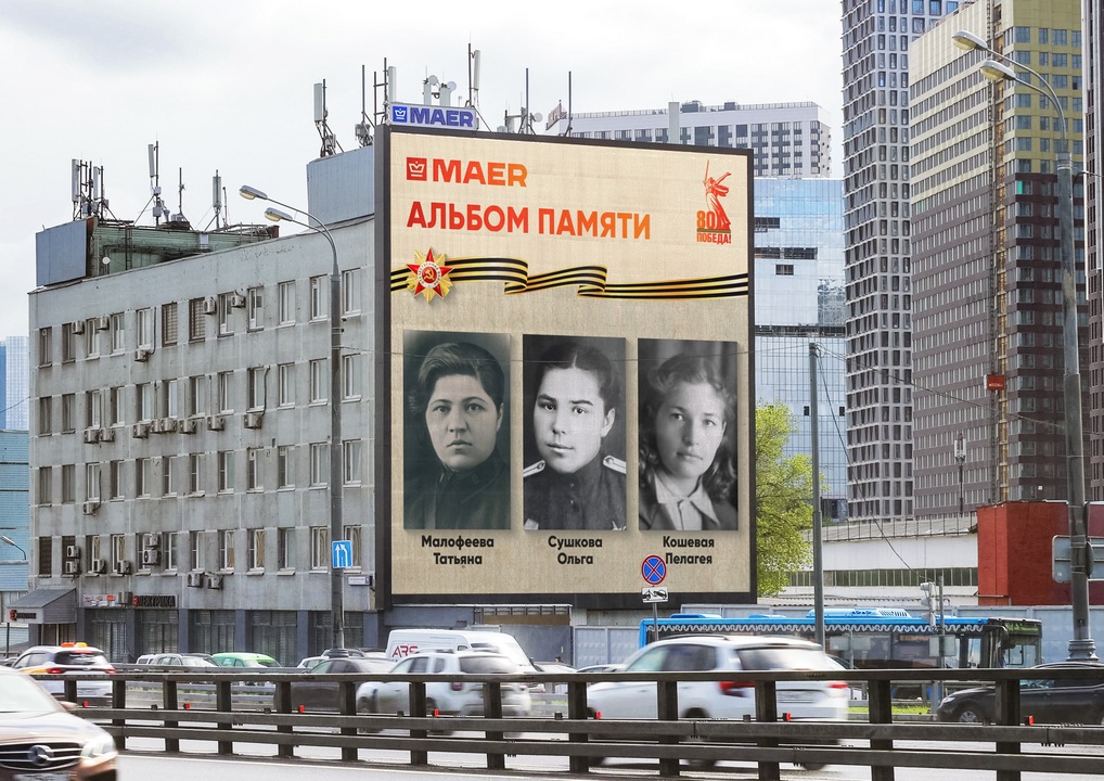 Помимо поддержки других проектов, МАЕР запустили свой «Альбом памяти». На медиафасадах транслировали фотографии бабушек и дедушек, родственников сотрудников — участников Великой Отечественной войны. Эти кадры, многие из которых ранее хранились исключительно в семейных архивах, увидели свыше 3,2 миллиона человек.
