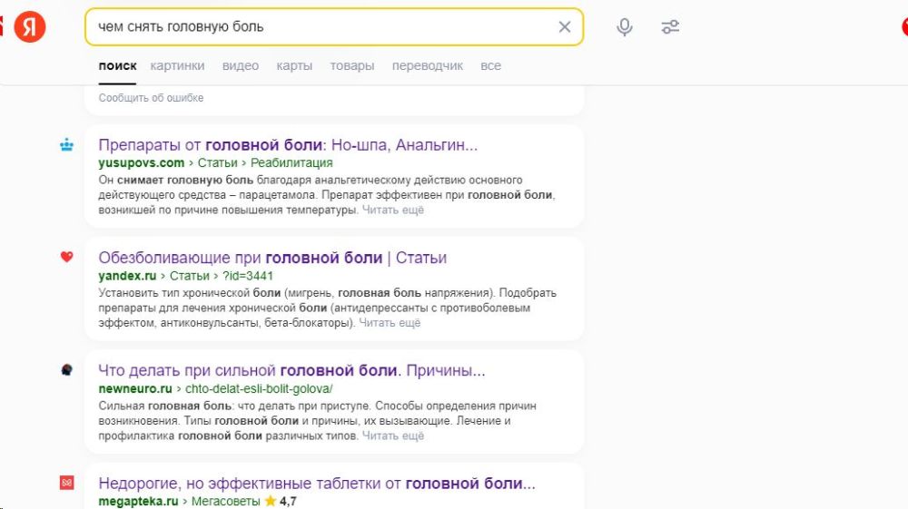 Из 10 результатов по запросу «чем снять головную боль» на первой странице «Яндекса»: