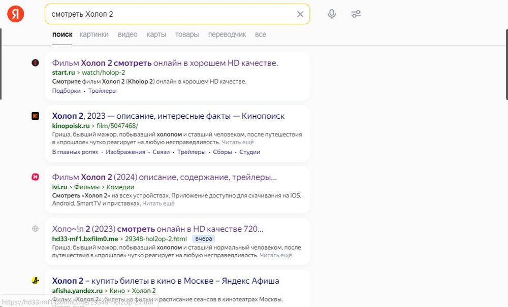 По запросу «смотреть Холоп 2» в топ-3 выдачи — онлайн-кинотеатры «Старт», «Кинопоиск» и «Иви». Причем в описании «Старт» и «Иви» предлагают посмотреть фильм онлайн в хорошем HD-качестве и на всех устройствах, а при переходе фильма не оказывается, что вполне логично, так как он пока в прокате. «Кинопоиск» предлагает почитать интересные факты и посмотреть трейлер. Четвертое место занимает страница пиратского онлайн-кинотеатра с бесконечной рекламой вместо фильма. На пятом месте в выдаче «Яндекс Афиша», где можно купить билеты в кинотеатры, чтобы действительно посмотреть фильм.