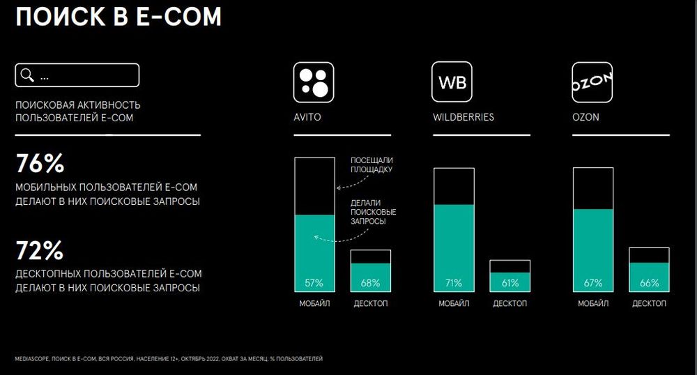 По данным Mediasope в 2022 году 76% мобильных и 72% десктопных пользователей e-com сайтов и приложений делали в них поисковые запросы.