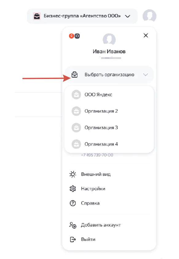 Процесс входа одинаков и для агентства, и для клиента с его сотрудниками. Не нужно выходить из текущего аккаунта, так как авторизация в паспортной организации не предусмотрена — возможен только вход через существующий аккаунт. Для этого достаточно нажать на название логина в правом верхнем углу и выбрать нужную организацию из списка в блоке «Выбрать организацию».