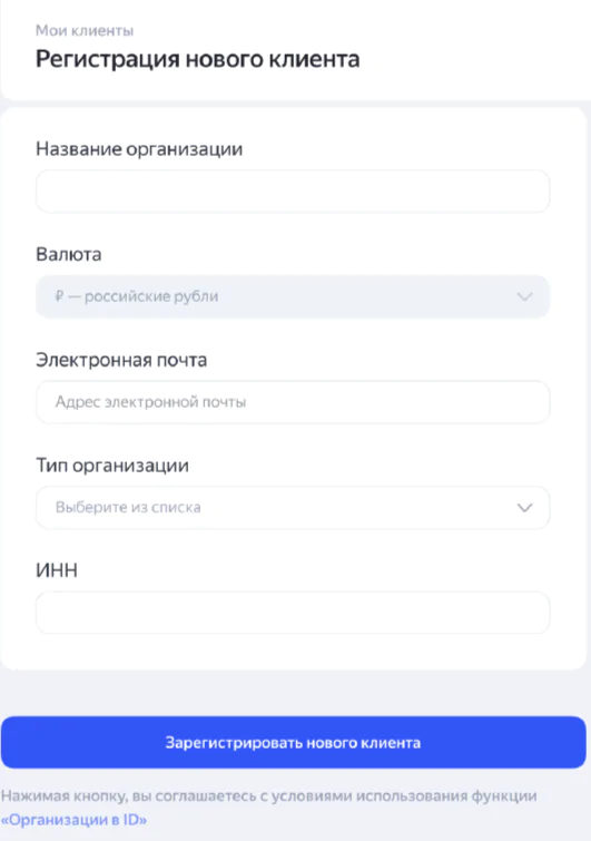 Агентству необходимо запросить эту информацию у клиента и заполнить соответствующие поля. После сохранения формы через кнопку «Зарегистрировать нового клиента» будет создана паспортная организация. Фактически это новый Яндекс ID с некоторыми особенностями: единый корпоративный аккаунт, через который сотрудники компании смогут работать в сервисах Яндекса.