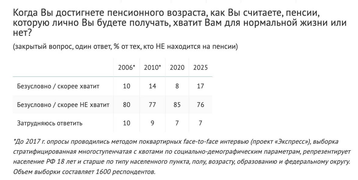 В то, что при достижении пенсионного возраста пенсии будет хватать на нормальную жизнь, верит менее, чем один из пяти россиян 17%). Это самый высокий показатель за время проведения подобных опросов. Меньше всего тех, кто верил, что на одну пенсию можно прожить, было в 2020 году — 8%. По сравнению с 2020 годом заметно снизилось число тех, кто уверен, что пенсии для нормальной жизни безусловно не хватит или скорее не хватит — с 85% до 76%.