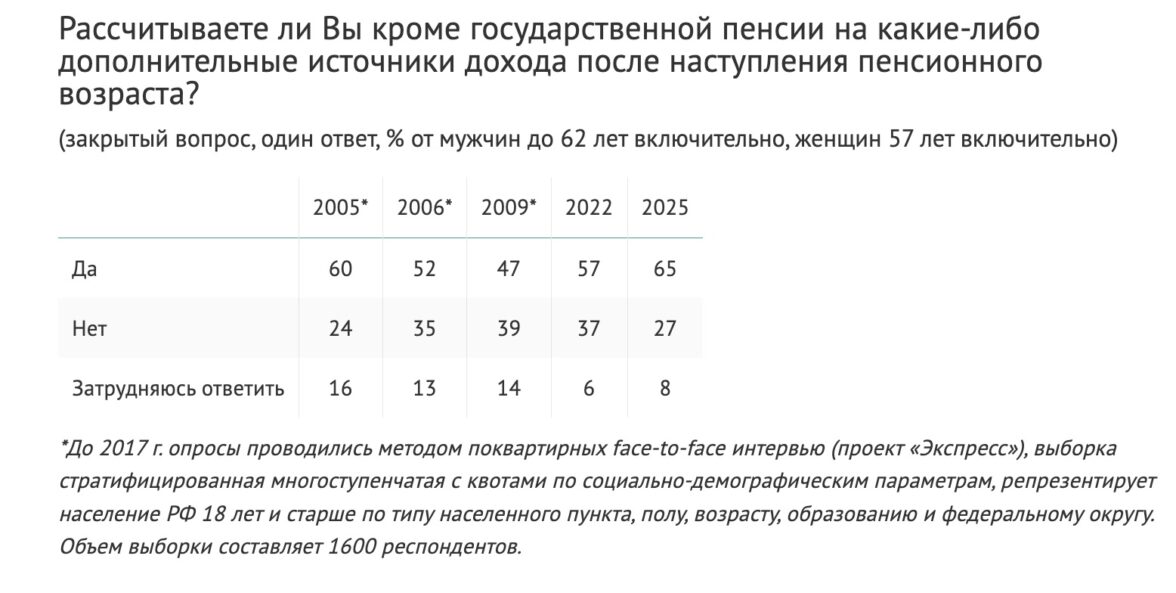 Две трети опрошенных (65%) рассчитывают, что в пенсионном возрасте у них будет дополнительный источник дохода, кроме государственной пенсии. Это самый высокий показатель, полученный в ходе аналогичных опросов за последние два десятилетия. До этого больше всего ответивших таким образом было зарегистрировано в 2005 году — 60%. А в опросе 2009 года о надежде на дополнительные источники дохода говорили чуть менее половины респондентов (49%).