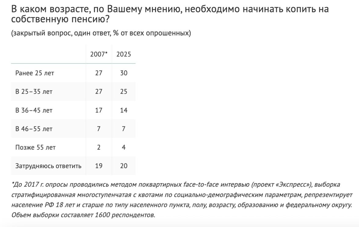 Более половины считает, что на пенсию нужно начинать копить задолго до выхода на нее. Примерно каждый третий (30%) думает, что начинать копить нужно в возрасте ранее 25 лет. Каждый четвертый (25%) — в возрасте 25–35 лет. По сравнению с результатами аналогичного опроса 2007 года цифры мало изменились.
