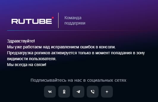 Скрипты Rutube грузятся с ошибками, о чем красноречиво свидетельствует консоль браузера.