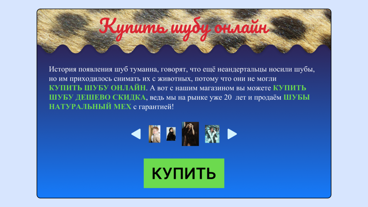 Бизнес видит тенденцию, поэтому переносит коммуникации в интернет. Проблема в том, что часть бизнесов делает это по старинке: стараются побольше рассказать о товаре, только теперь не вживую, а на сайте. И вот покупатель загуглил «купить шубу», зашел на сайт и вместо адекватного каталога с условиями доставки и возврата видит сео-заголовки и простыню об истории возникновения шуб.