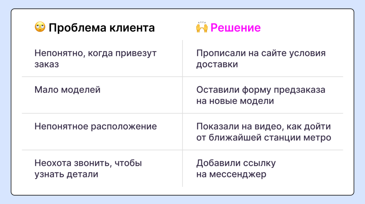 Эти решения — гипотезы, которые нужно тестировать. Возможно, вы поняли что-то неправильно. Это окей, работа над коммуникациями с клиентом — постоянный процесс. Поэтому нашли проблему — решили — получили обратную связь.