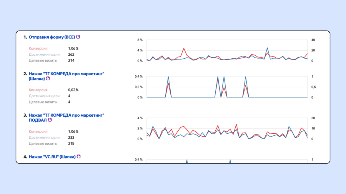 Пример конверсий нашего сайта: мы отслеживаем лидов — то есть тех, кто заполнил форму для начала работ, переходы в телеграм-канал и в блог на vc.ru