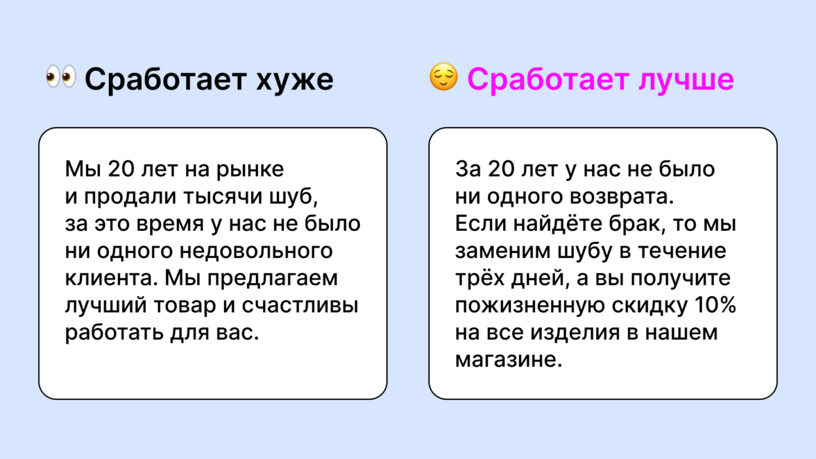 Поставьте себя на место человека, который хочет купить шубу, но переживает, что потратит много денег на некачественный товар. Что из этого убеждает лучше?