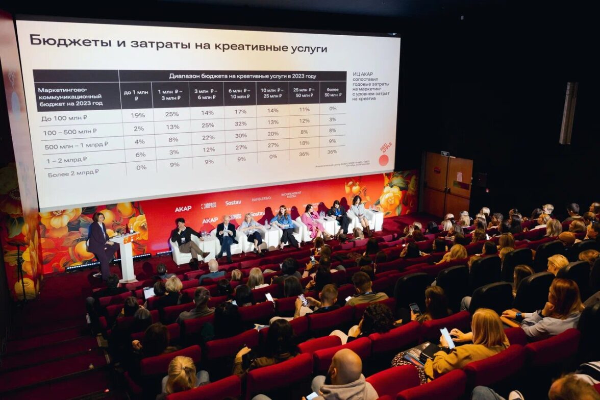 Управляющий партнер РА «Восход», сопредседатель комитета креативных агентств АКАР представил на сессии исследование отношения рекламодателей к креативным услугам, проведенное аналитическим центром АКАР/АРИР/РАМУ/ГИПП. Согласно полученным данным, в 2023 году рекламодатели с годовым маркетинговым бюджетом более 100 млн рублей расходовали на креатив всего 1,3-4,1% от него.