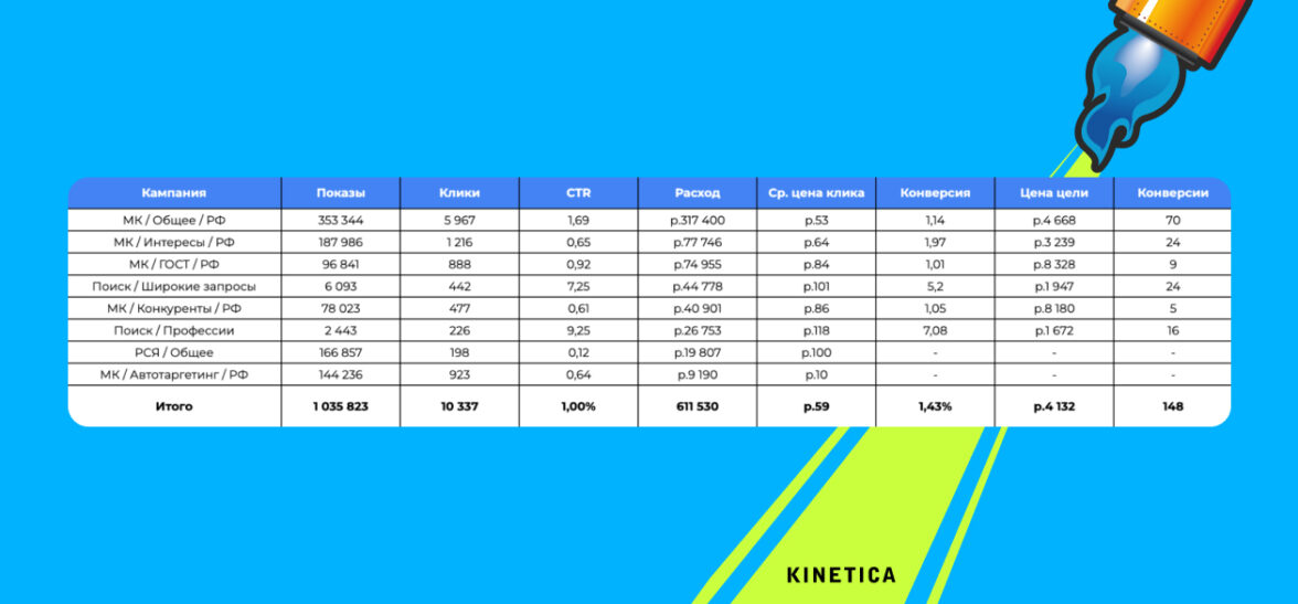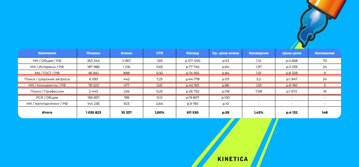 Мы запустили 4 кампании в РСЯ и Мастер-кампанию. Через несколько недель диагноз был ясен: РСЯ-кампании показывали нулевую эффективность. Трафик был, но он был «пустым». Зато полуавтоматическая Мастер-кампания «Общее/РФ» дала первые 20 заявок с крошечным CPC в 12 рублей.