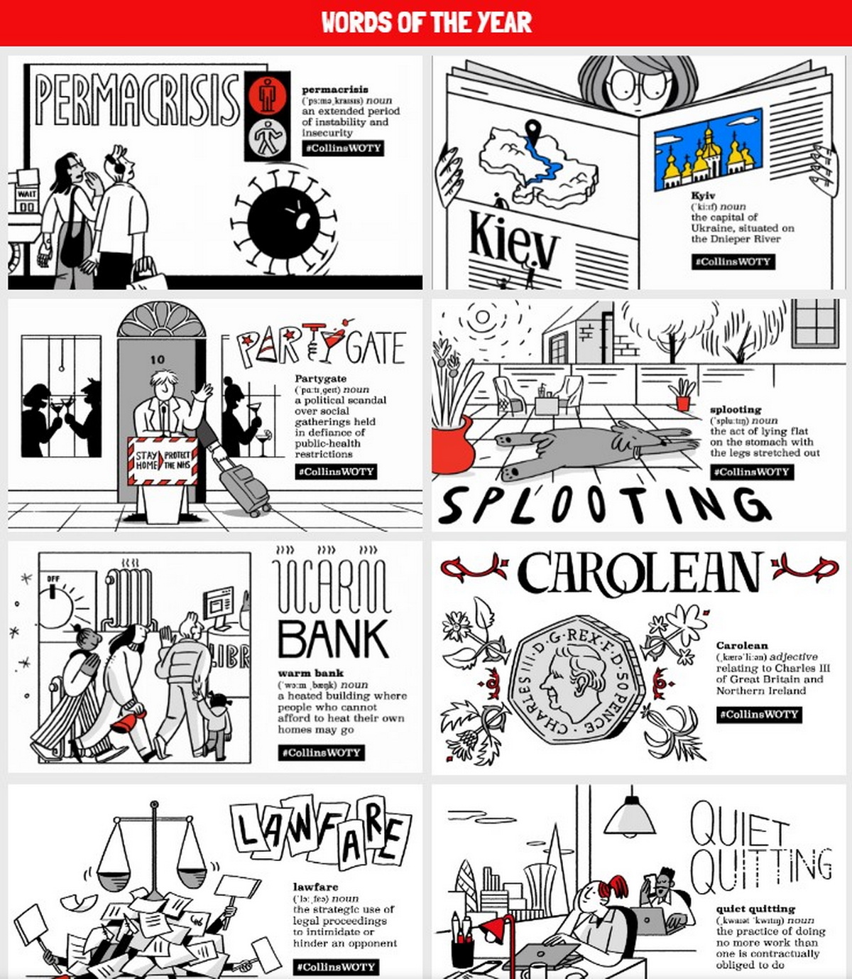 «Это лишь одно из выражений, выделенных Collins, которое описывает продолжающиеся кризисы, выпавшие на долю британцев и всего мира. Речь идет о политической нестабильности в стране, военном конфликте в Украине, а также об изменении климата и повышении стоимости жизни. Шесть слов в списке являются новыми для CollinsDictionary.com, включая „пермакризис“», — говорят создатели.