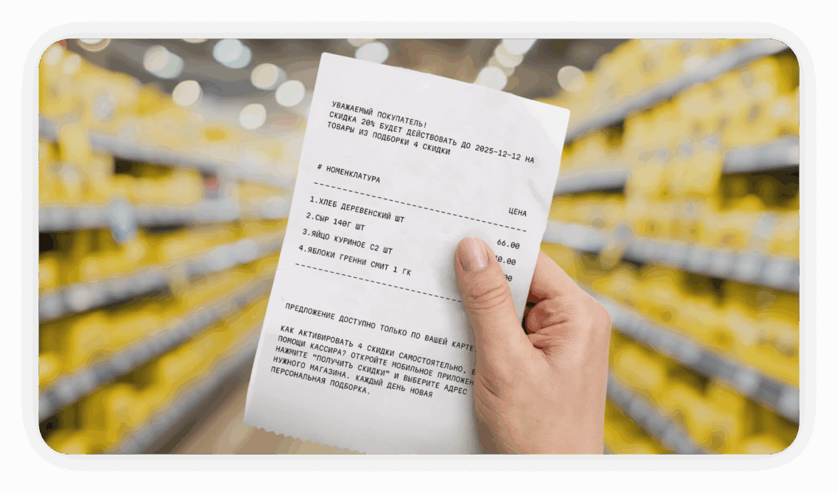 Результат на кассе. Скидки применяются. Покупатель получает слип-чек с полным и понятным перечнем примененных и доступных персональных акций на текущий период.