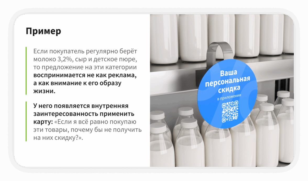 Это простое, визуально заметное, но очень грубое средство. Оно говорит с покупателем на языке массовой выгоды, а не индивидуальной потребности: их эффективность с точки зрения вовлечения в программу лояльности ограничена из-за того, что эти предложения универсальны и не учитывают личные предпочтения покупателя.