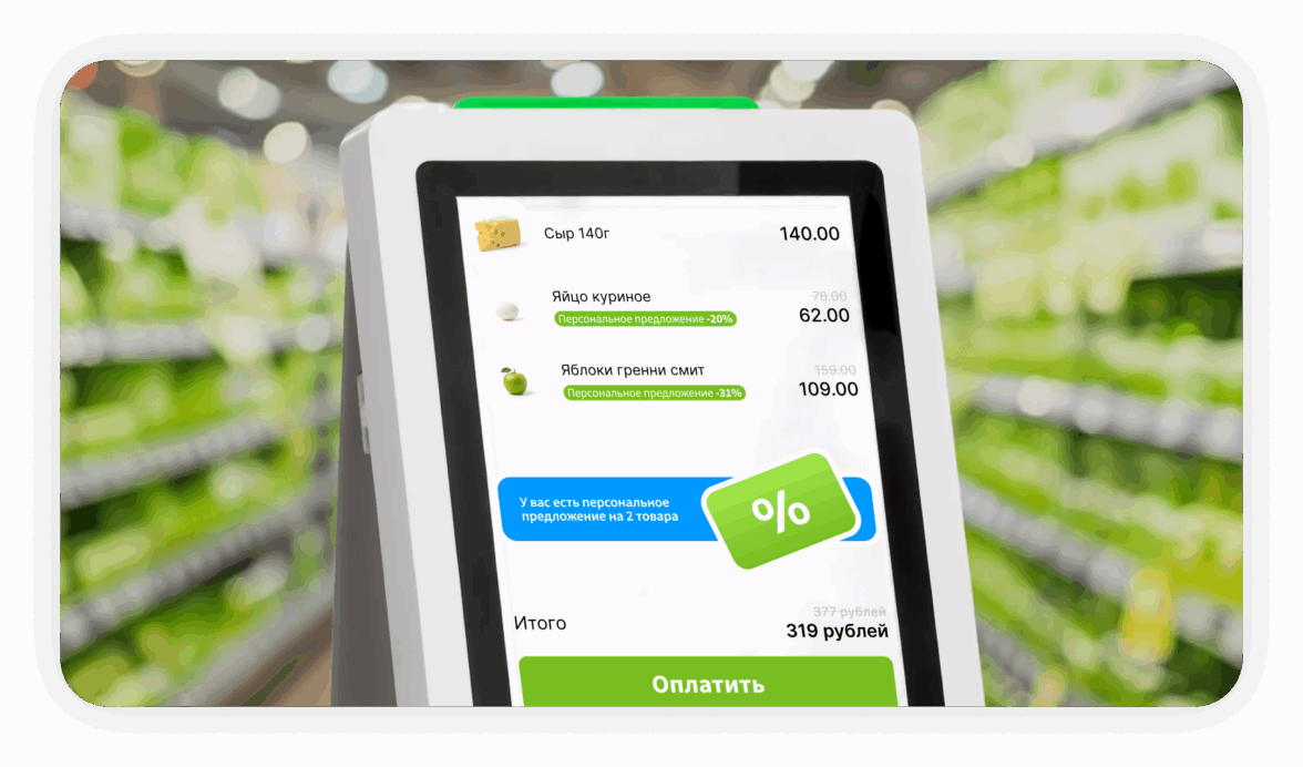 Сообщение на дисплее касс самообслуживания (КСО). Многие сети уже используют этот экран для демонстрации того, как изменится цена при применении карты на товары, участвующие в массовом промо. Аналогичный механизм может быть использован для вывода сообщения о наличии персональных скидок. После применения карты покупатель видит свои персональные предложения на экране КСО и получает поощрения по ним.