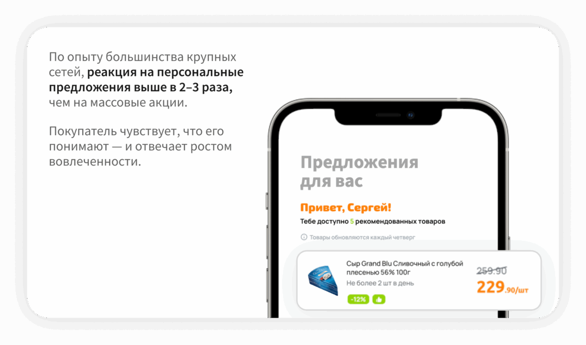 Персональные акции решают проблему ценности предложения фундаментально. Они не навязываются — они резонируют с реальной потребностью.