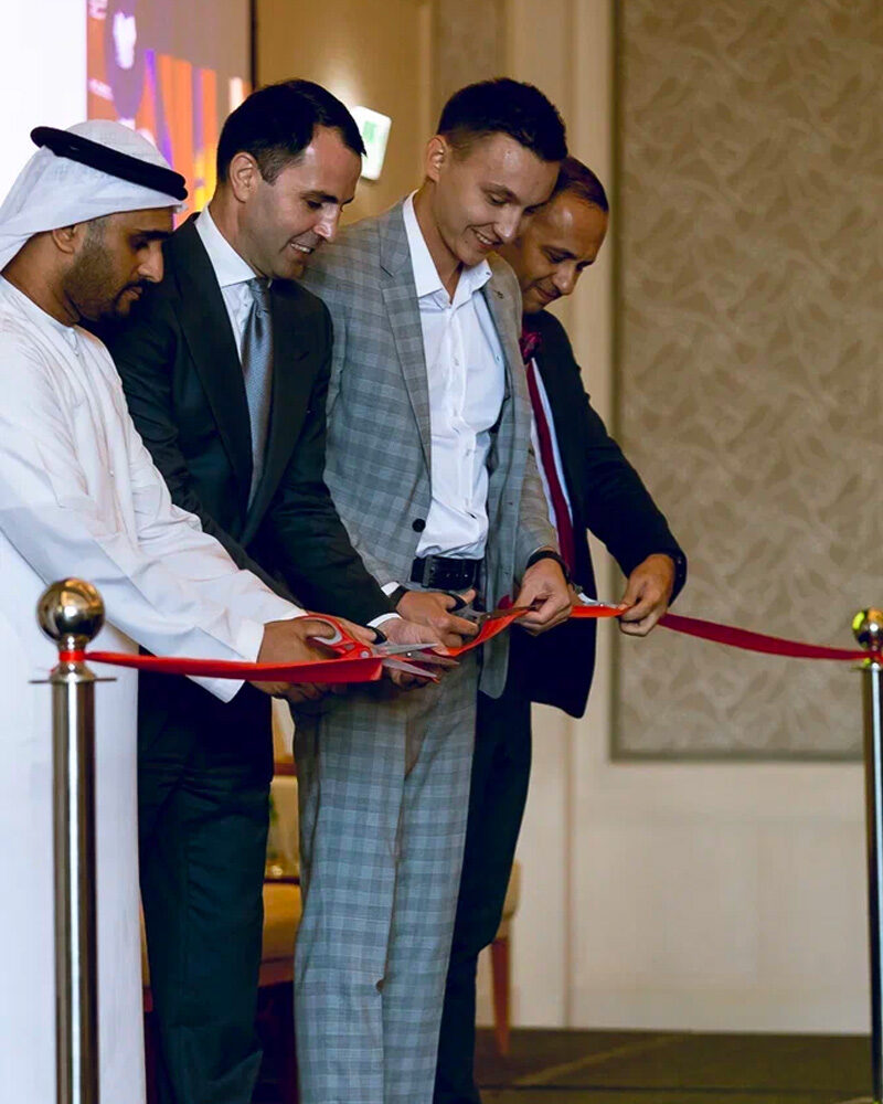 Основатель премии Никита Лобанов и участники форума «Бизнес без границ», режут ленту на премии в Дубае, 2022 год