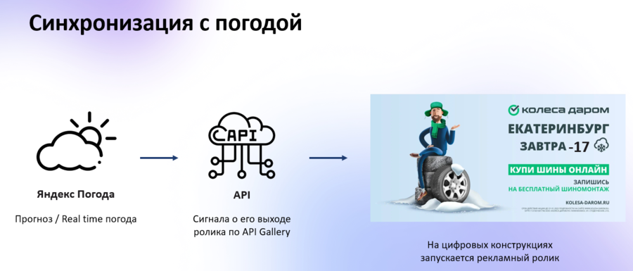 Отличный кейс представила компания Gallery на майской конференции AdIndex GoUp 2023 в Каире. В креатив сети шинных центров «Колеса даром» встроили онлайн-прогноз погоды «Яндекса». Чтобы усилить эффективность кампании, выход рекламы на билбордах синхронизировали с радиорекламой. Во время трансляции джинглов по API Gallery проходил сигнал, и на цифровых конструкциях запускался креатив клиента.