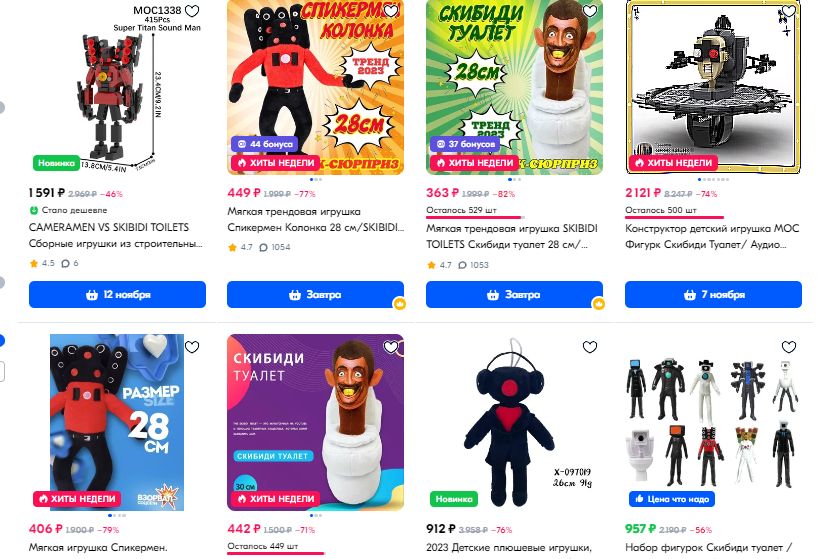 Во всех российских маркетплейсах продаются мягкие игрушки, конструкторы, фигурки, брелоки, майки, свитшоты и даже раскраска-антистресс с героями Скибиди-саги: унитазами и камераменами. На Ozon количество наименований под брендом Skibidi Toilets превышает 19 тыс. единиц, на Wildberries — 3 тыс, на Aliexpress — 8 тыс.