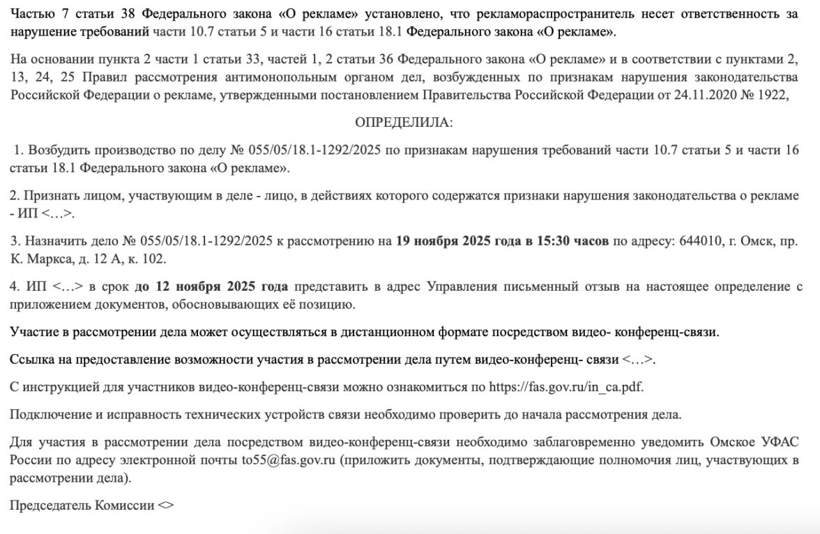 Дело будет рассмотрено в омском УФАС 19 ноября. Ася Сивоконева сообщила ADPASS, что не согласна с выводами УФАС и будет обжаловать определение. Она утверждает, что покупала все товары сама и не собиралась их рекламировать.