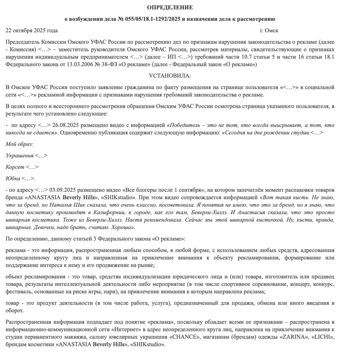 На видео в антимонопольную службу пожаловалась подписчица. Омское УФАС решило, что информация в этом рилсе подпадает под понятие «реклама», поскольку обладает всеми ее признаками — распространена в интернете в адрес неопределенного круга лиц, «направлена на привлечение внимания к брендам косметики Anastasia Beverly Hills и SHIKstudio».