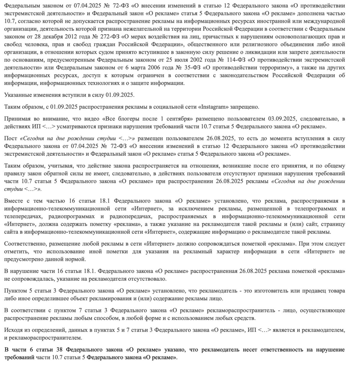 Из определения также следует, что служба, как и обещали ранее, не будет штрафовать за рекламу задним числом — за контент, размещенный до 1 сентября. Подписчица пожаловалась еще на одно видео от 26 августа — в подписи блогер перечислила бренды, составляющие образ на видео. УФАС отметила, что «по общему правилу закон обратной силы не имеет», поэтому не будет наказывать за факт рекламы, но штрафует за отсутствие маркировки.