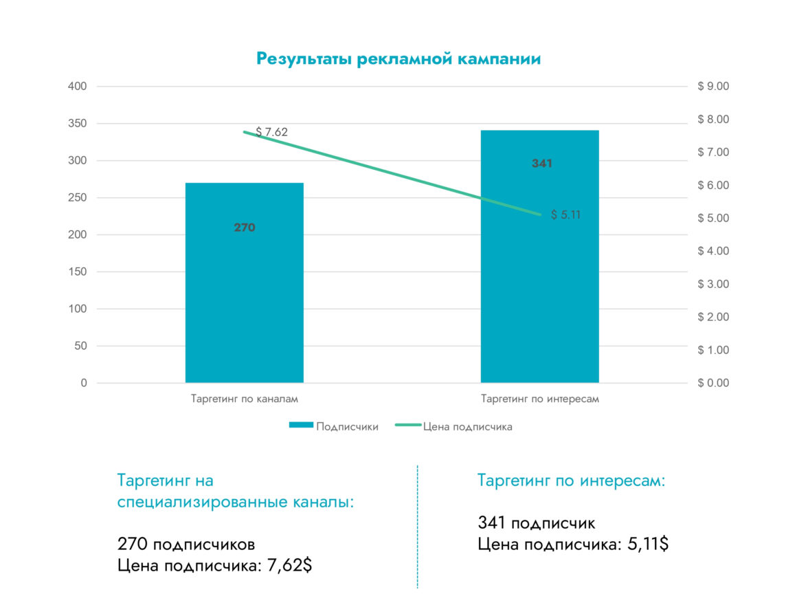 Таргетинг по интересам привел на 26% больше подписчиков, а таргетинг по специализированным каналам — более качественных пользователей.