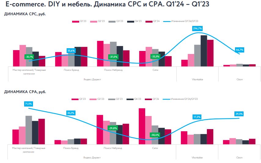 В первом квартале 2024 года на российских торговых интернет-площадках (e-com) и маркетплейсах стоимость клика (CPC, отношение бюджета рекламной кампании к общему количеству кликов по рекламе) увеличилась более, чем на четверть (+26,3%) к показателям аналогичного периода 2023-го. Стоимость конверсии (CPA, стоимость целевого действия пользователей, отношение бюджета рекламной кампании к количеству совершенных действий) выросла на треть (+33,2%), — следует из отчета, опубликованного рекламной группой E-Promo. Абсолютных значений по обоим показателям группа не приводит. По сравнению с последним кварталом прошлого года стоимость клика снизилась на 9,6%, а конверсии — выросла на 9,5%.