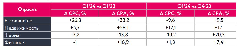 Всего авторы исследования проанализировали более 74 тыс. рекламных кампаний с суммарным бюджетом более 6,3 млрд руб. из четырех отраслей. Помимо e-com это финансы, фарма и недвижимость. Совокупно в этих четырех отраслях стоимость клика в первом квартале текущего года выросла на 11% к первому кварталу 2023-го, конверсия подорожала более чем на 37%.